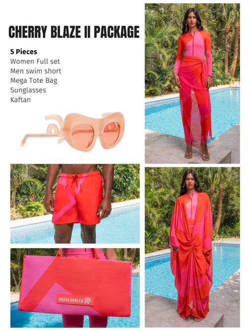Swim in style, step out complete. This full set includes swimwear, tote bag, sunglasses, a breezy kaftan, and matching men’s shorts—everything you need for the ultimate beachside moment.